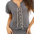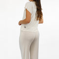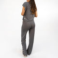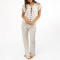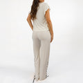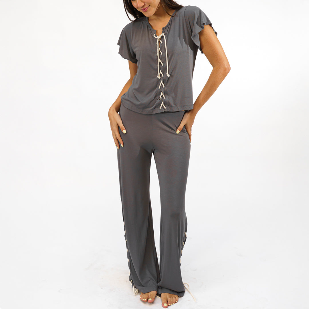 Choose your style with the Nona set, you can tie your shirt up to the top, or unstring the laces for a deeper neckline. Play around with the slit of your long pants, loosen the strings for an open slit. Be comfortable and get creative to make this pijama your own.